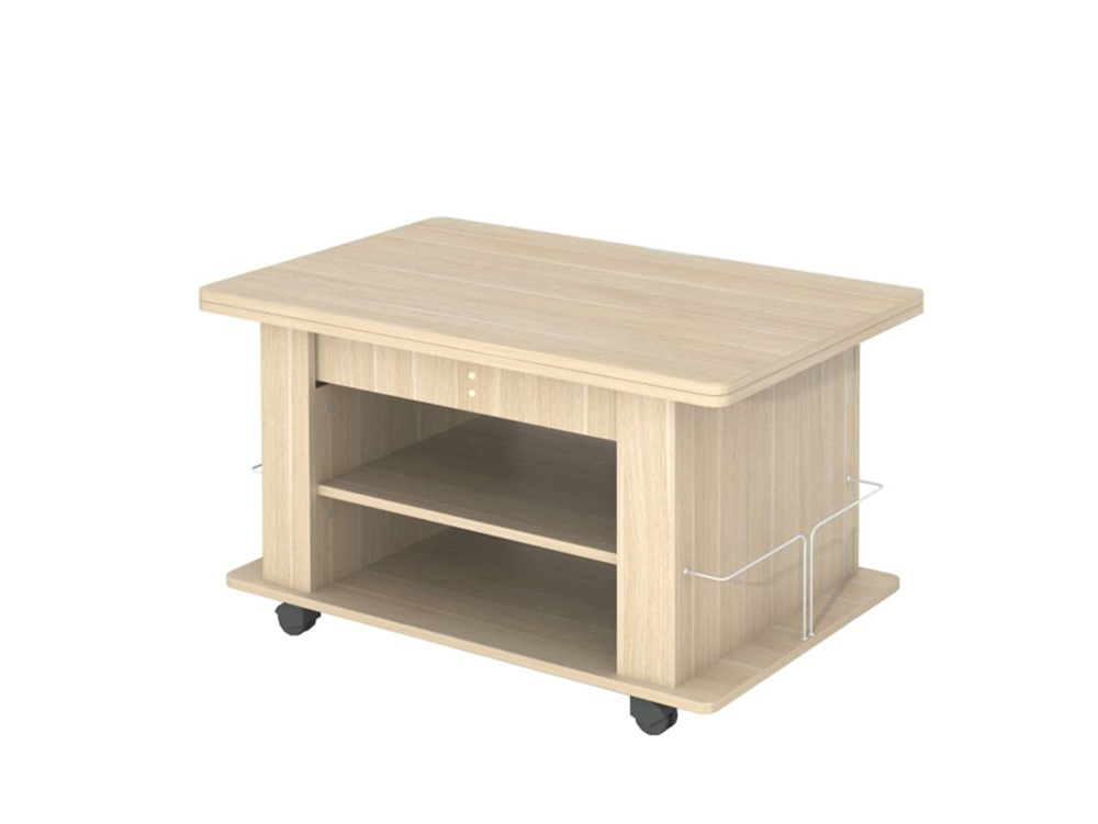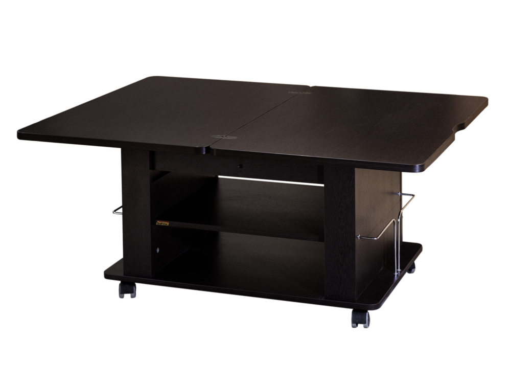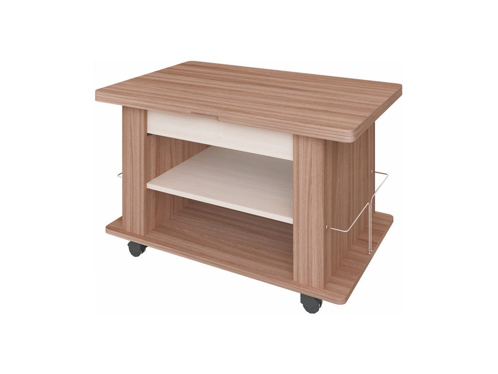 «Агат 19.2» – многофункциональный стол, который может использоваться в различных положениях, представленных на схемах. Это достигается за счет наличия подъемного и поворотного механизмов, которые превращают журнальный стол в обеденный. Данную модель дополняет металлическая газетница и ниша для хранения мелочей.