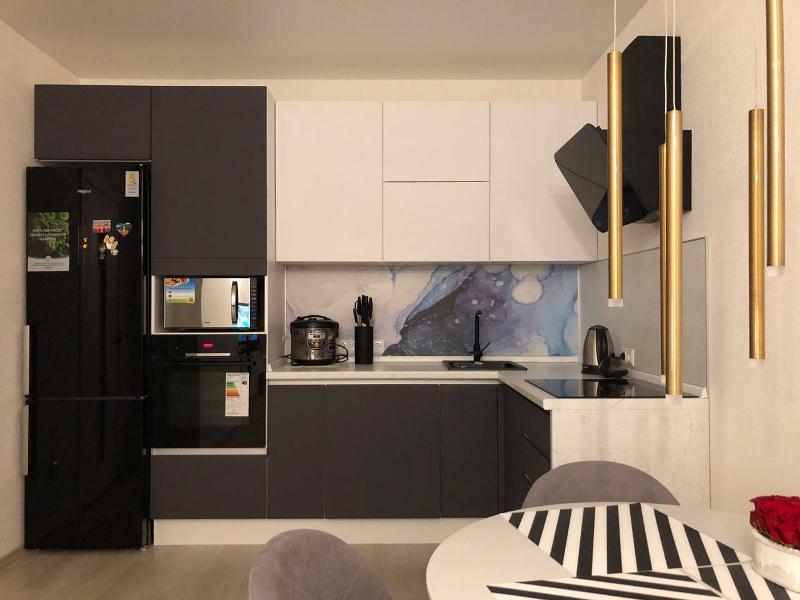 Цвет корпуса, фасада, столешницы, стекла, ручки могут быть практически любыми, цена при этом не поменяется. Кухня может быть оснащена доводчиками (Blum, Boyard).